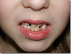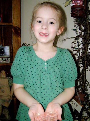 Last week Madison had 3 teeth that were very wiggly and ready to come out. She lost her bottom one that was loose last Thursday 2/28/08. I knew the other two top teeth were going to also come out any day. She has been wiggling them a lot to try and get them out. Yesterday in the bathtub I felt one of her top teeth and it was literately just hanging there so I pulled on it and it came out! She was so excited!! Now all we had to do was keep wiggling the other top tooth because it was the only one left that was loose. I thought it would last another day or two. At school today 3/04/08 she was sent to the clinic and the Nurse pulled it out. As you can tell the "Tooth Fairy" has been very busy at Jack Flash Lane. :)